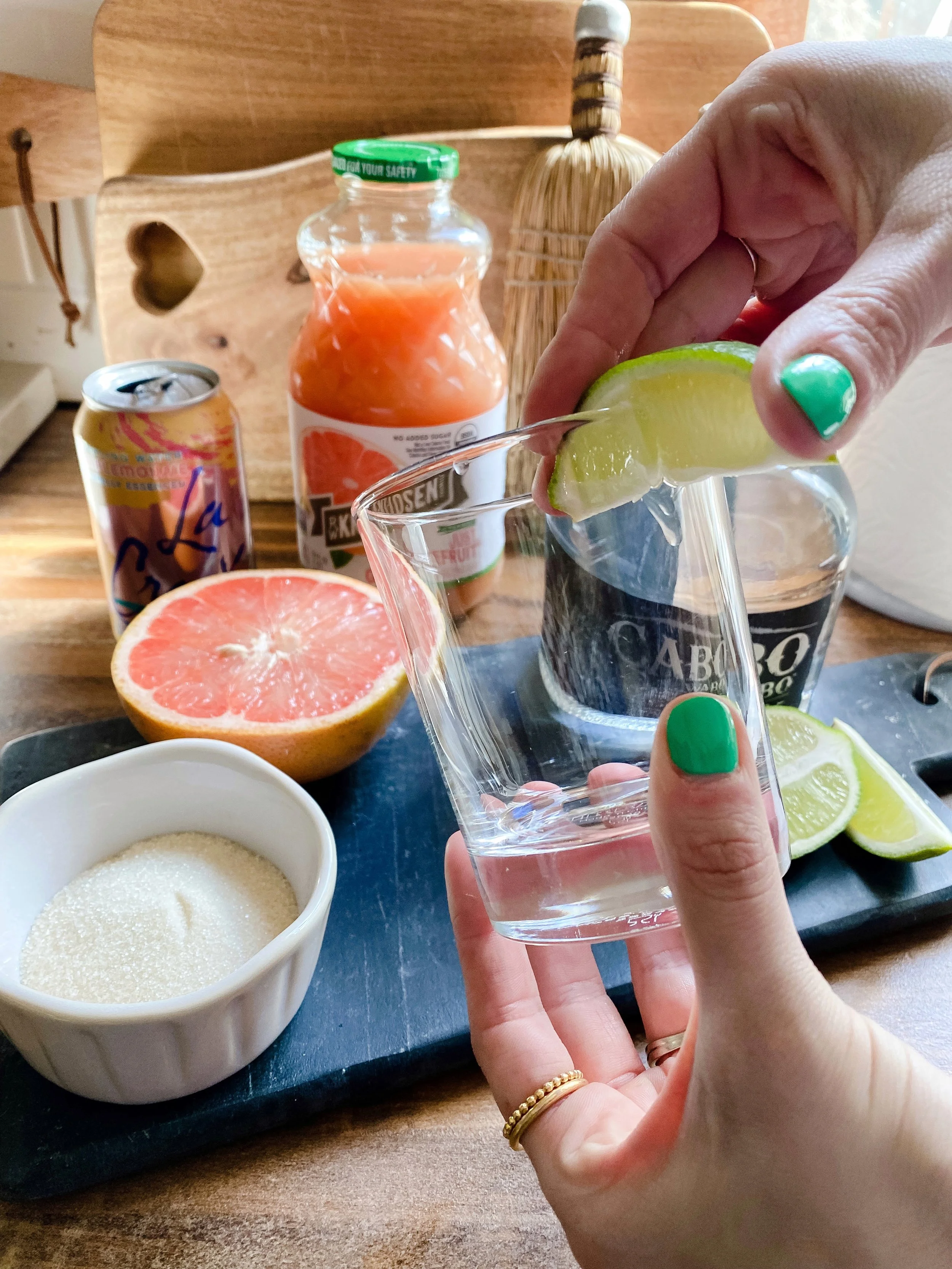 /This beverage is Curtis and my go-to when we are enjoying an evening dinner out. What I have made here is a knock-off to please my taste preferences and cut calories. Like with most things, I like to eyeball and make it up as I go along – meaning I do not have exact measurements for this, you just do what you like to taste. If you like things on the sour side, add more grapefruit juice, like it on the stronger side, heavy pour that tequila.